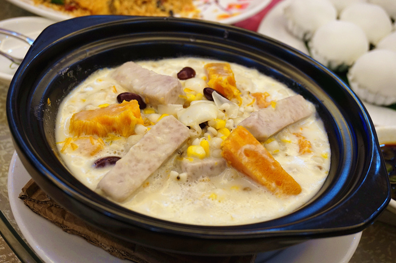 再嚟个健康餸:飘香五谷粗粮煲。呢种养生菜肴Celia大爱呀!南瓜、薏米、粟米都超中意。
