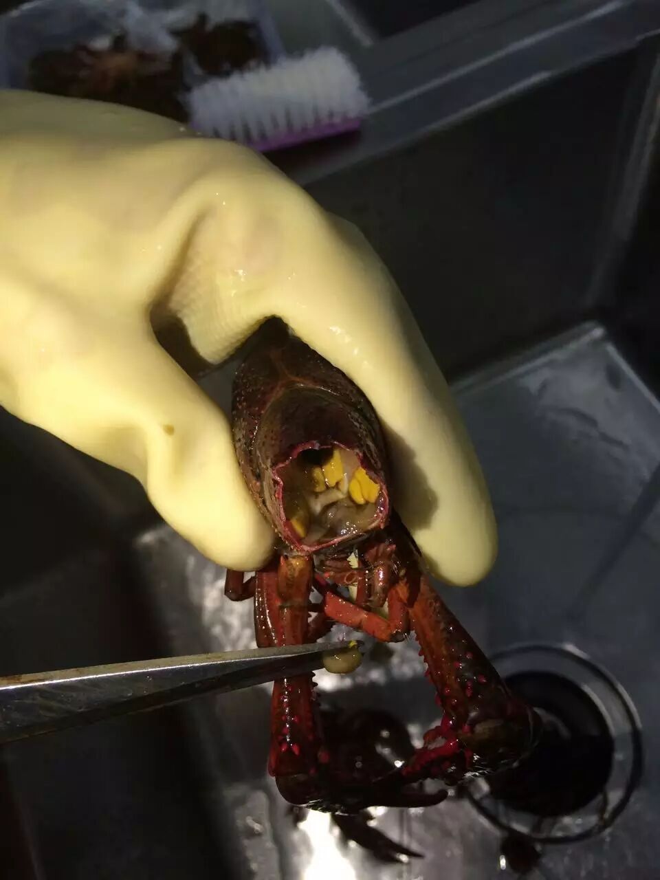 接着开始清理小龙虾的头污,用剪刀将龙虾头部和两腮里的脏东西去除,确保吃货们在品尝美味的同时也能吃的干净吃的放心。