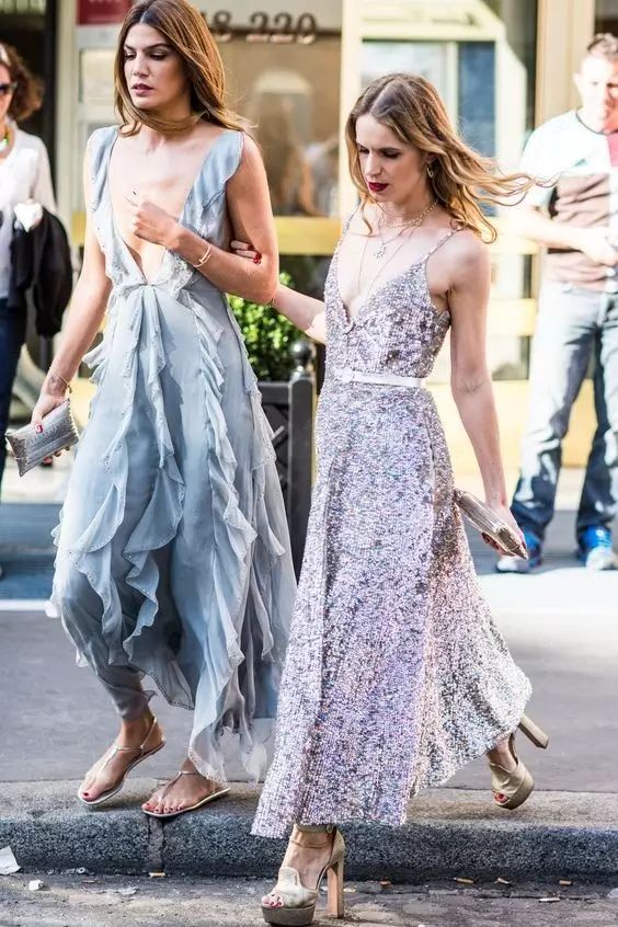 适度露肤也能显高,对于小个子来说,包裹太严实容易被长裙“淹没”。这个时候,领口就很重要了。领口高的话,上半身是被加长的,想要显高,你们要做的是拉长下半身,所以领口低一些,更有利于拉长下半身的比例。