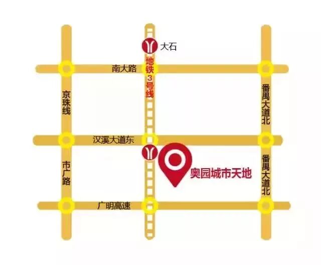 地铁汉溪长隆站 3号线C出口/7号线G出口,步行至奥园城市天地潮玩食尚街