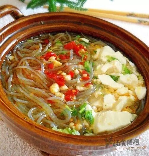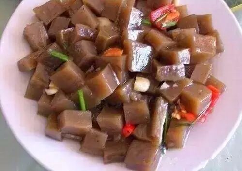 苦楮豆腐是高安伍桥有名的农家小菜,它来源于一种天然的食品——苦楮树所产的苦槠子。苦槠子暴晒之后,去掉种皮,再将里面的种仁浸泡、磨浆,置于锅中煮热沸腾,待熟制之后,蒸发出一些水分。等到置冷成型之后,一块块粉褐色的豆腐就这样神奇地出现了。 苦槠豆腐一般是炒着吃。切成小片之后,放上点肉沫,加入点辣椒粉,出锅前再在面上撒一些葱花,一碗喷香扑鼻,色泽美观,用筷子轻拨,还带点果冻般那种微微韵动的农家小菜,就这样端了上来。带着天然的清香,入口即化,口感上用伍桥人那个“揪嫩揪嫩”的形容词来形容再合适不过。