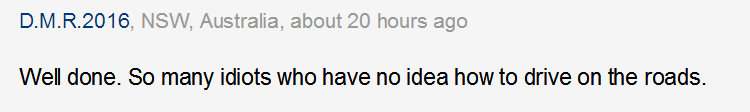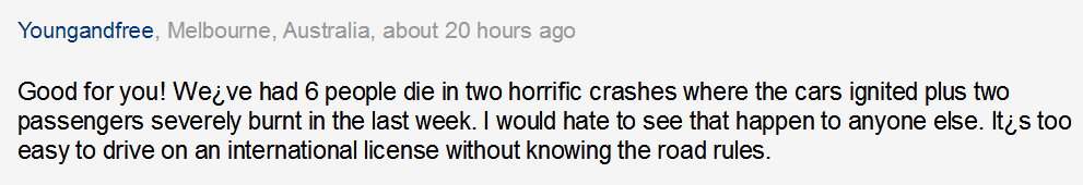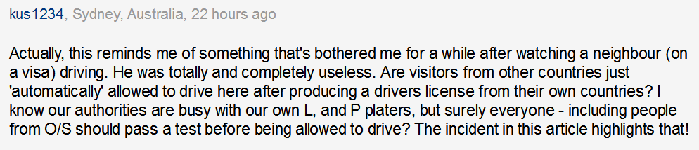 “这个新闻让我想起了一件之前看我的一个邻居(拿着签证来澳洲的外国人)开车的糟心事。他完全就是个废物。凭啥外国游客只要在自己国家拿到了驾照,就可以直接在澳洲开车?!我知道政府在忙着应付我们本国的司机,但是每一个人都应该先通过测试之后才能开车上路不是吗?这个新闻充分证明了这一点!”