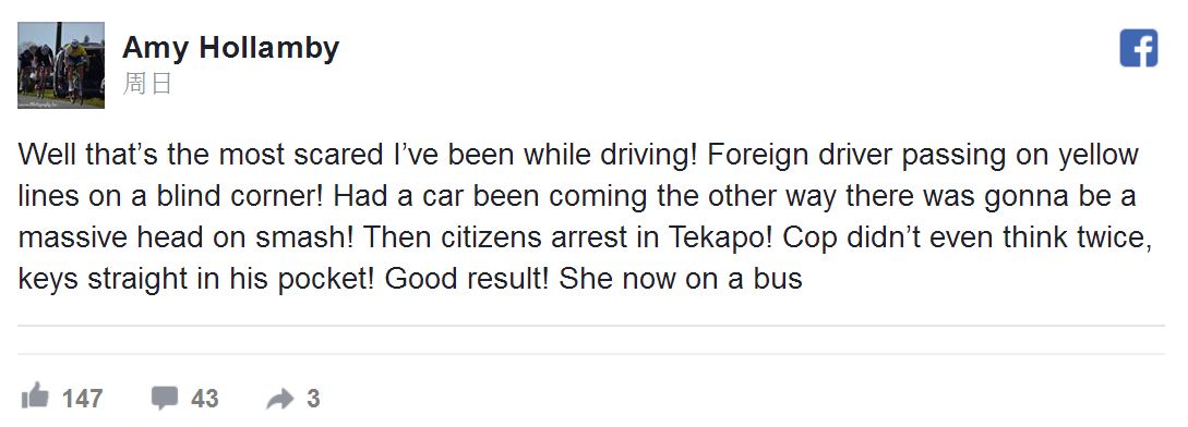 对于这位司机如此鲁莽和不负责任的行为,Amy觉得非常气愤。因此,几分钟之后,当超车的女司机到达Tekapo停车时,Amy和另外两位被超的司机直接把车开到了她四周,