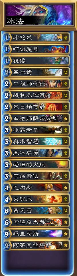 带一张吃鱼魔典就算是一种隐形投资,1费下去可以压住猎人的2费怪,这是玻璃比不了的,毕竟11是有攻击力的,但是带2张又嫌多了,有时候手牌几乎满的,再开出一张高费法术就坑了,更何况带了巴内斯被拉出来也亏。给个冰箱扰咒冰甲冰环暴风雪哗啦都非常赚,小投资大收益。