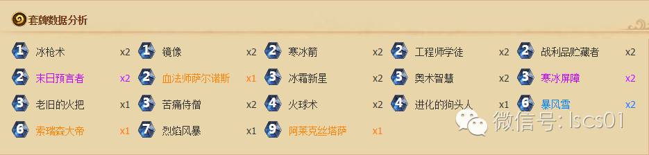 从版本初期的沉寂后就开始逐渐发力,直到这个赛季数量已经赶上术士成为第二梯队,无解的天胡起手和准时的8费螺丝对冰法来说都是致命的,上个赛季对德的胜率有60%+,而这个赛季却降到了50%以下,并不是卡组有什么变化,完全是这个职业的特性体现,也就是所说的上下限差距巨大,运气占很大成分,这个赛季我能清晰记得的被导演翻盘的稳赢局就不下4场,有挂“以眼还眼”的,有挂“冰箱”的,有打出“盾格”+“撕咬”的,有打出“照明弹”的,就差直接塞我一“拉法母的诅咒”省的夜长梦多了。这个对局中前期的鹿盔、紫罗兰、熊德都值得一火球解,蓝龙值得寒冰箭,冰环末日一般很难成功,所以末日可以用来卡对方节奏,这一点和曾经打咆哮德是一致的,例如对方8费前且场攻不足7点可裸下末日逼对方用费用来解末日而无法下螺丝。