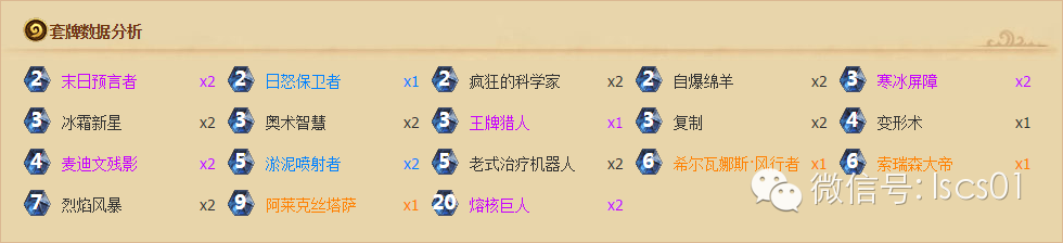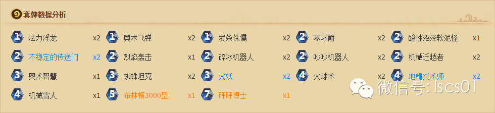 很多高端玩家都认为,火妖法是火妖法,机械法是机械法,两个体系差别较大,不好共融。不过这套卡组把加入了奥术飞弹+火妖,橙卡传送门,小软吃猎人战士还可以配合布林顿,各种看上去异想天开的组合却形成的令人惊异的战绩。