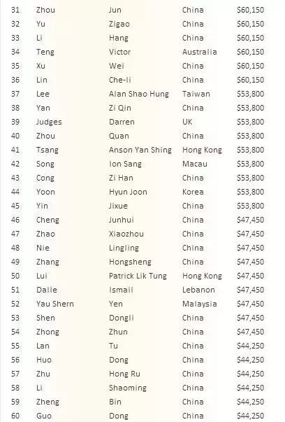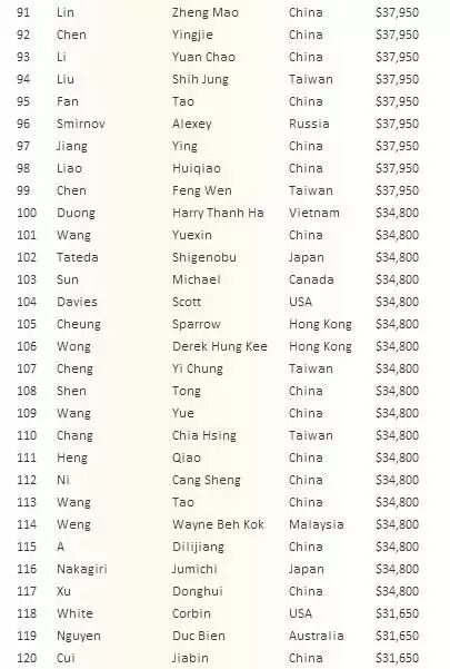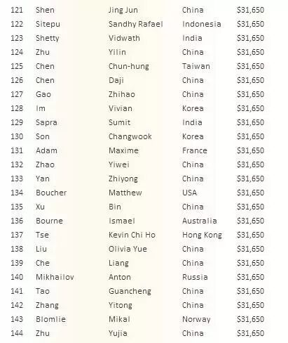 以下为奖励圈各选手名次奖励: