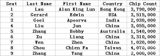 以下为9人决赛桌各选手位置及计分牌情况: