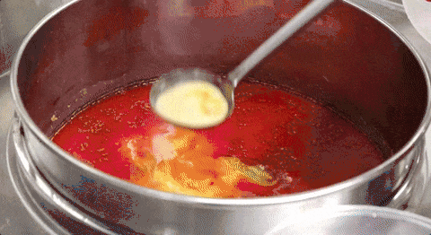 到出锅之后加入老板特别熬制的高汤了!没错就是锅红油热辣的汤料。