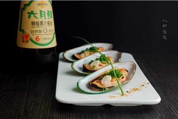 2、腌汁中的酒酿可以为青口贝祛腥,其本身的甜味也起到了吊鲜的作用,而六月鲜特级原汁酱油则为整道菜的味道建立了基底,能最大程度体现青口贝的鲜味。