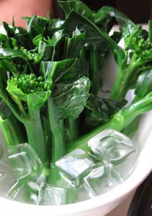 ↑冰镇芥兰:翠绿的芥兰盛开在冰块之上,晶莹剔透之余更富清爽之意,芥兰口感清凉爽嫩。