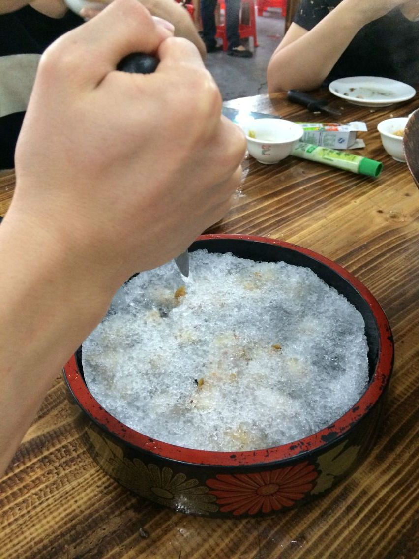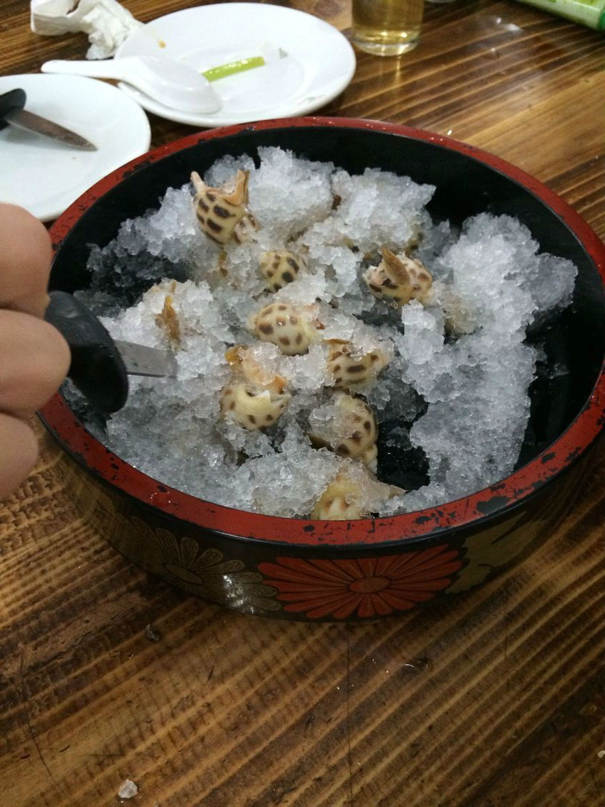 可能刚端上来的时候会以为是冰盘,并等待放东西上去。实际上,花螺已在里面乖乖躺着等你来消灭。