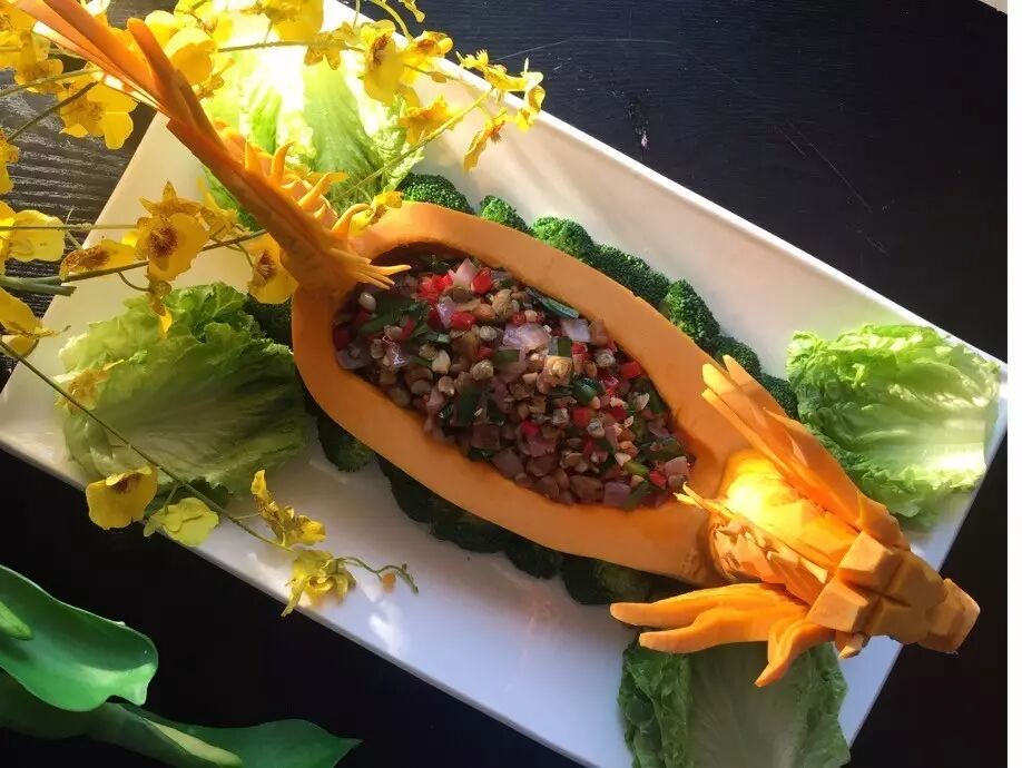 这道龙舟什锦肉光是原料就得准备至少8种,材料十足,营养丰富,色彩诱人,味香可口。精致而特别的造型秒杀不少手机内存。
