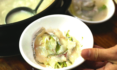 等鱼汤滚之后一镬淋落鱼身度,一起一落所谓“过桥”。起落瞬间,烟雾四起,碗里面的鱼都郁埋,仲有一阵清新的鲜味喷出。