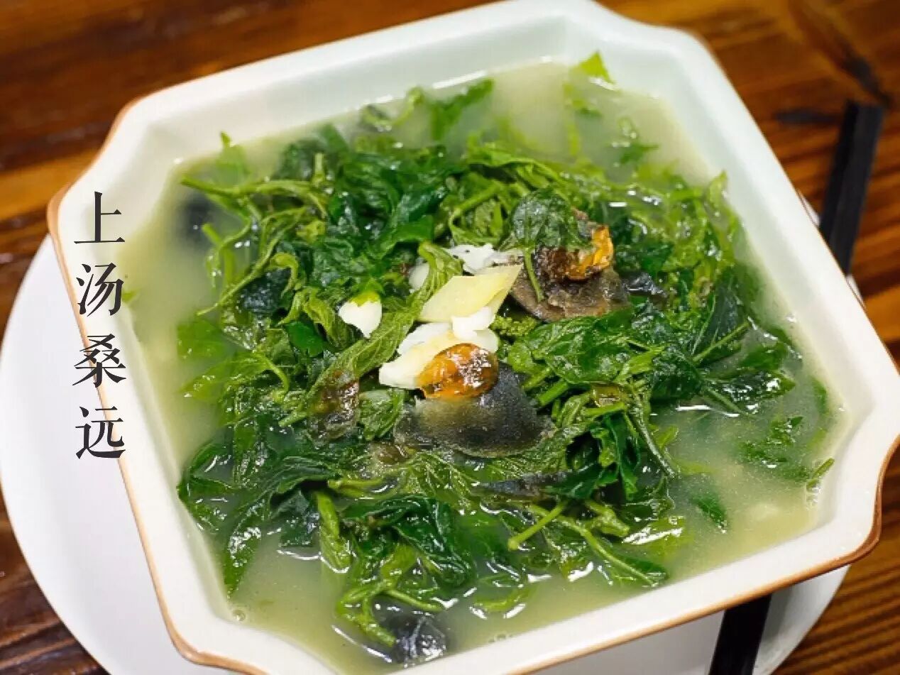 用桑叶幼苗上汤煮,入口轻轻有D孩,嚼多记下口腔仲有回甘,食疗功效非常好,可以疏散风热、清肺润燥、清肝明目,啱晒成日出于亚健康状态的都市人。平时食咁多垃圾食品,就要靠蔬菜清清肠胃。