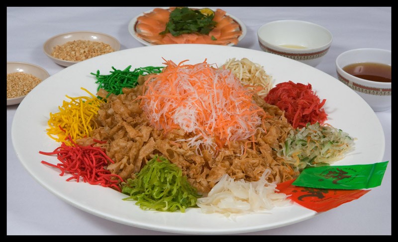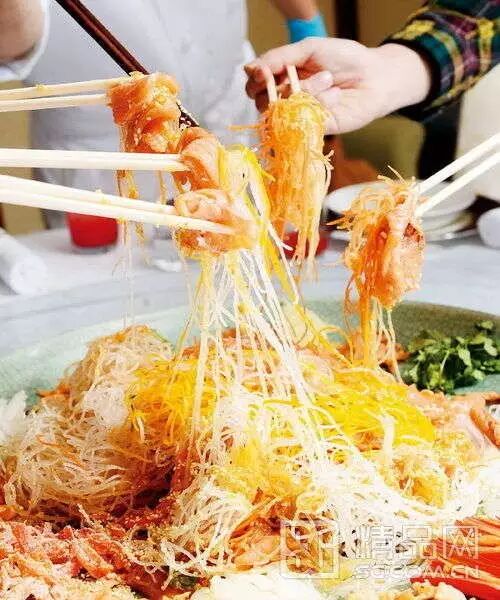 至于生鱼片,最常用的大概是三文鱼片,也有用鲍鱼片或其他的,素食者干脆连鱼都不放。鱼在捞鱼生里有被喧宾夺主的嫌疑:一来鱼的分量少,二来因为捞鱼生变成一种节日活动,食物本身是否真的可口已经不那么重要。