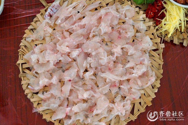 首先鱼生的主角必然是鱼,由不得配料蘸酱来捣乱格局。潮州的鱼生多用草鱼,也有用凌箭鱼或石娟鱼的。鱼的个头必须不大不小,肉的弹性和口感才会适中;淡水鱼易带泥味儿,所以鱼必要养在洁净的沙池中。现开的草鱼不可马上切片上盘。放血去鳞开肚之后,起出鱼背上两片净肉,用干布抹干,再把鱼肉晾在在通风处。此时假如正直北风天那就更好了,稍微风干过的鱼肉鲜甜里带着嚼劲,口感奇妙无穷。