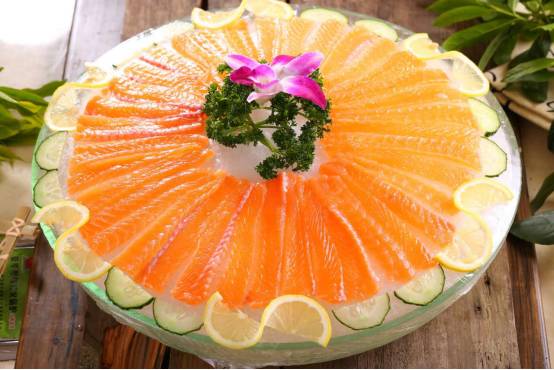 店里有十几种东江鱼 先说卖得最好的三文鱼:作为最具代表性的冷水鱼,店里的都是活鱼现杀,肉质鲜美,口感Q弹劲道,十分爽口,而且一鱼三吃~ 鱼肉做成刺身拼盘 鱼头鱼边可以选择剁椒或者椒盐 鱼腩可以煲汤