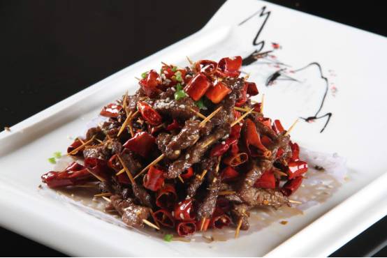 特色三:牙签牛肉:制作出湖南人最爱的香辣口味,秘制牛肉配上芝麻、孜然、香葱加上牛肉新鲜,肉质紧致,这道美食是我个人最爱!!