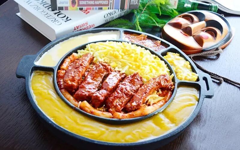 最近最火的一抹黄,当然非韩国料理的芝士排骨莫属了。安东的芝士排骨是由秘制的排骨,还有满满的浓郁芝士、细腻的南瓜粥、嫩滑的鸡蛋羹以及香甜的玉米粒通过加热的方式制成的。一个两个食材,清一色全是美味的黄色。浓浓的芝士香味让人垂涎三尺。缠绕着排骨的芝士可以拉出很长的丝。肉香、芝士香,吃在嘴里更是美味香辣。