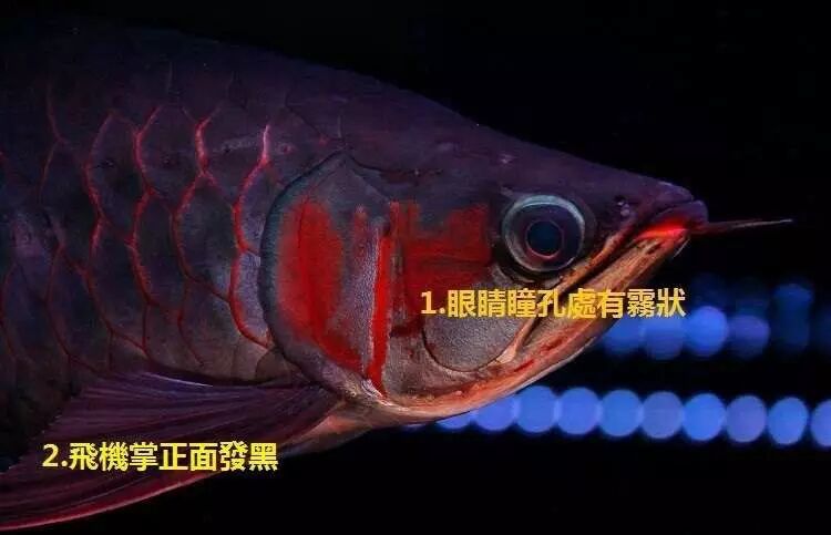 第一张图片我标注了两点,龙友可以放大图片。看一下眼睛,眼睛黑色瞳孔表面有雾状,鱼眼神呆滞。这个雾状,就是打灯打过头,鱼眼球被灼伤。龙鱼的眼睛有神经和龙鱼大脑相连,如果灯用过头了,结局就是,龙鱼出现神经错乱,天天撞缸,最后的结果,撞缸而亡!