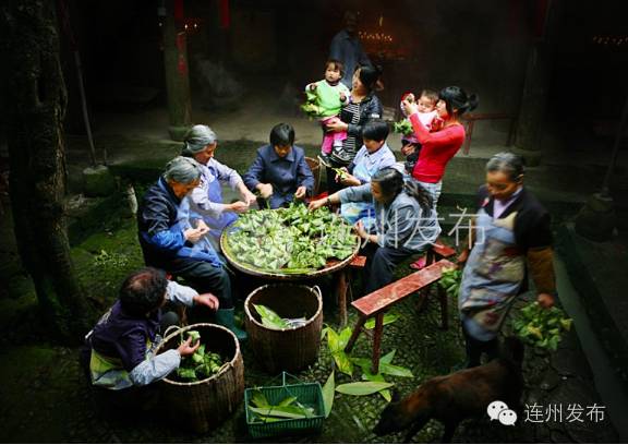 在连州,村村寨寨都有过端午节的习俗,以西岸镇最为隆重。西岸镇是连州的一个文化古镇,历史悠久,底蕴深厚。端午节是西岸的一个古老的节日,节日当天,家家户户亲朋满座,吃粽子,尝美食,喜乐融融。粽子用大片的竹叶包裹,以糯米、烧腩肉、咸蛋黄、红豆、绿豆、花生做馅,吃上一口,唇齿留香。