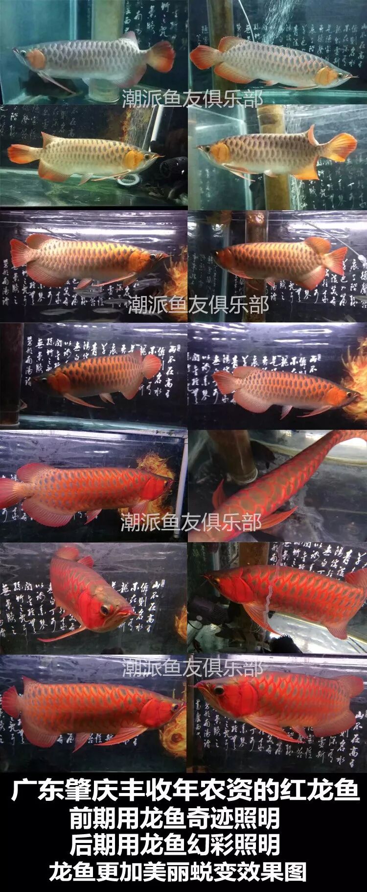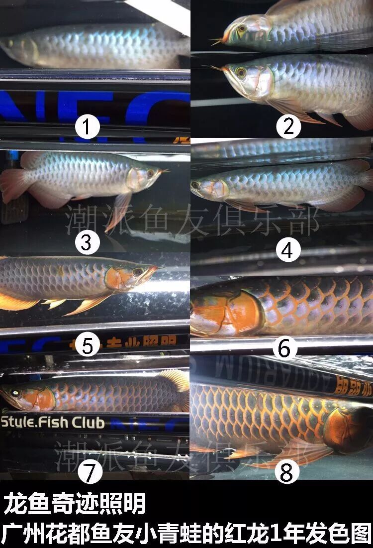 在红龙鱼体长大约30公分时,鱼体前半部分第一鳞框开始发色,接下来第二鳞框发色,并且鳃盖处的发色会加大加深,在这个阶段会让人觉得红龙鱼的发色停止了,使饲养者丧失信心。其实这个是正常现象,发色并没有停止,只是不明显而已。