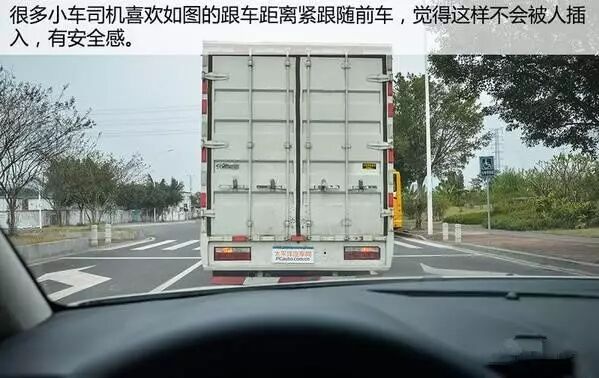 8.小车司机驾驶时喜欢紧跟着前车,问其原因得知为了不让人插进来,这样行驶很有安全感,前车怎么走我跟着走就是,然而大货车的后侧也是盲区。