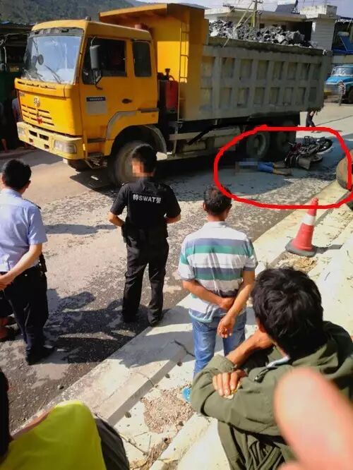 昨日14时左右,213国道红龙厂段发生一起严重交通事故,一辆大黄蜂渣土车将摩托车碾压至车轮底。