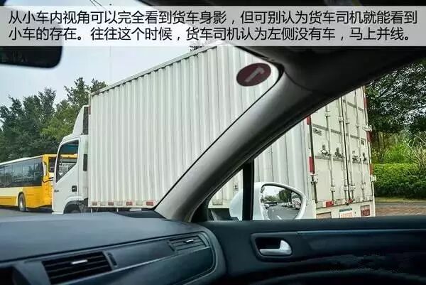 2.货车右侧是盲区,日常行驶时,常碰到货车走在道路中间的线,有时快车道又有慢车阻挡,只能从货车的右侧超车,往往这时候极其容易发生交通事故。