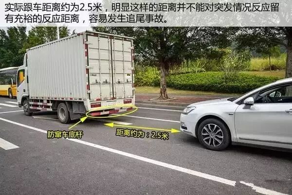 9.从外观察实际跟车距离约为2.5米,快速行驶时,若前车发生紧急制动,即便驾驶员反应时间再快,后车根本刹不住。 若是跟在大货车后面发生追尾,极可能会窜入货车底部,直接被削去车顶,可直接致命,非常危险。