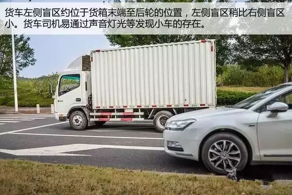 3.绝不能待在货车盲区:车身越大盲区越大,行驶时绝对不能待在货车两侧盲区并排行驶,同时尽量不要从右侧超越货车。