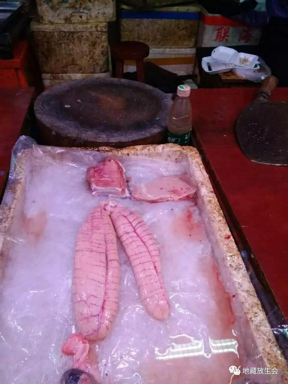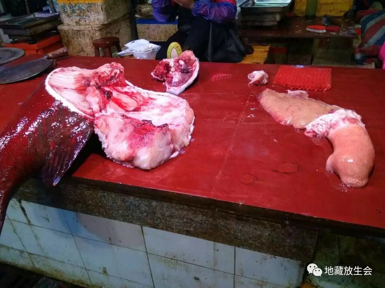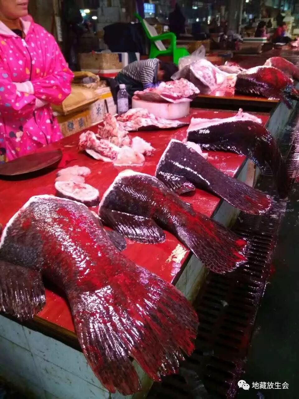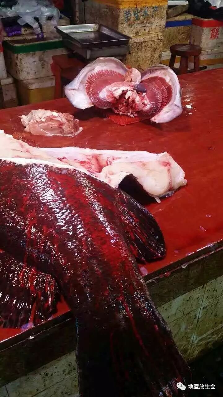 进到市场内就看到,有一些超级大的龙砻已经被杀,血淋淋的!在现场看到非常恐怖!我马上进到店内,看到还有很多活命的大龙砻,其中最大的155斤,有多条!比成人还大!看到一条条的大龙砻悠闲地游着,他们还不知道可能自己马上就要被杀!