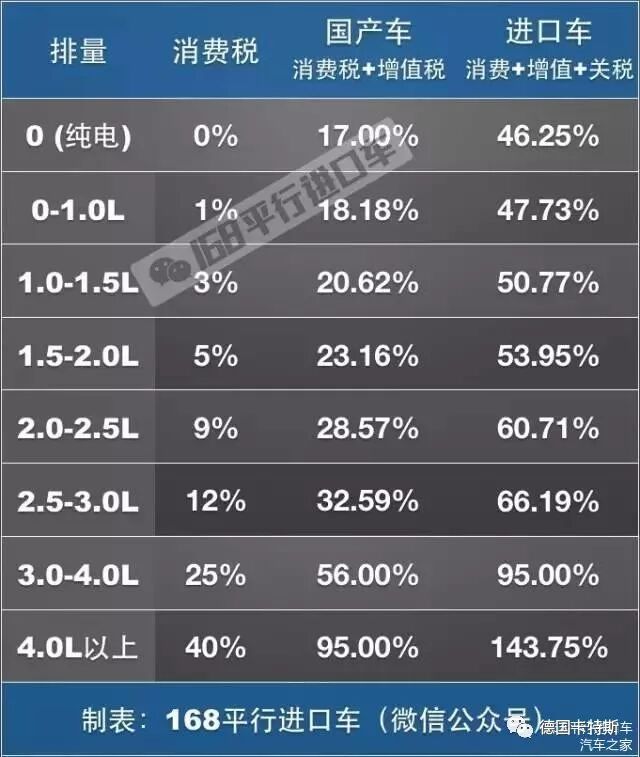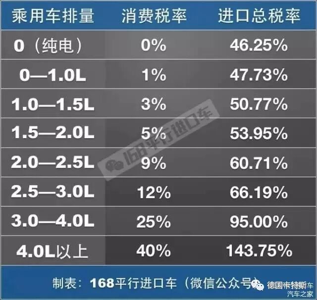 无论国产还是进口,厂商都要交消费税。只不过进口车多了关税,复合之下,消费税率(或者说排量)对总税率的影响被进一步放大了: