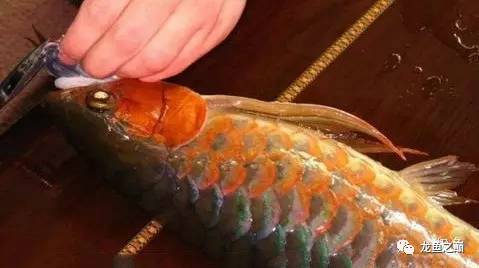 比如这条鱼就是刚才那只我朋友饲养3年的红龙,手术时可以看到它的5排位置明显发出靛蓝色光泽,这样的光泽在很多杂交金龙身上是常见的。