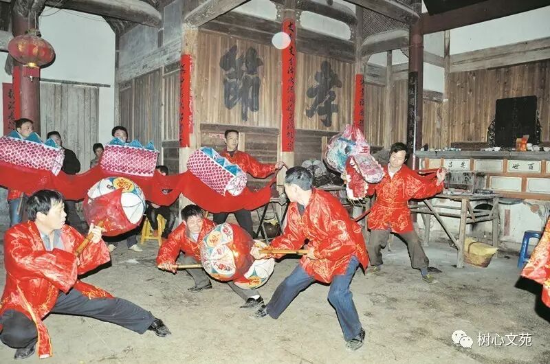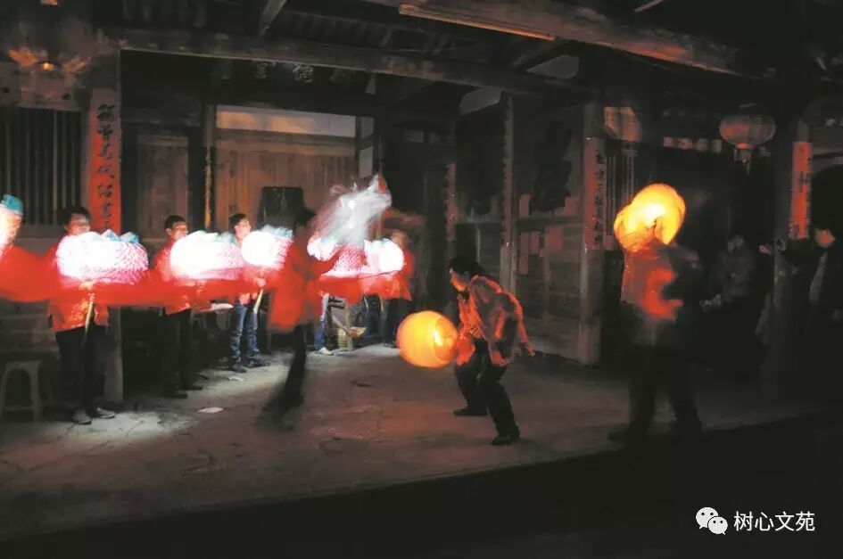 正月时节,薄暮降临。随着咚咚锵、咚咚锵的锣鼓,间或伴有砰啪的鞭炮炸响,我知道,红龙出游了。心如鼓点,急匆匆跑步跟随。前方有主人放响高升炮迎接,红龙队便踏着鞭炮,迈入厅堂,舞将起来。三人手擎龙珠,脚走“四勾拔”武术步,一人舞龙头,脚踏“六九拳”步或“四平步”,龙身随着龙头的舞动而微微摆动,忽而珠逗龙,龙抢珠,忽而龙戏珠、龙藏珠、龙找珠,忽而龙头随柱舞动,龙身紧紧随行,缠绕而上,将正厅四根大柱(俗称四点金柱础)一一舞遍,让你不禁联想到“翩若惊鸿,矫若游龙”,叹为观止。就这样,穿古街,走深巷,从杨姓梓叔舞到黄姓梓叔,从黄氏家庙舞到杨氏家庙,看不厌,行不累,往往迎着鞭炮,争着抢拾未炸响的哑炮,想想不用左缠右磨难得零花钢蹦换甩炮,明天一大早就可以炸水炮,炸泥炮,晚上做梦都会笑呢!