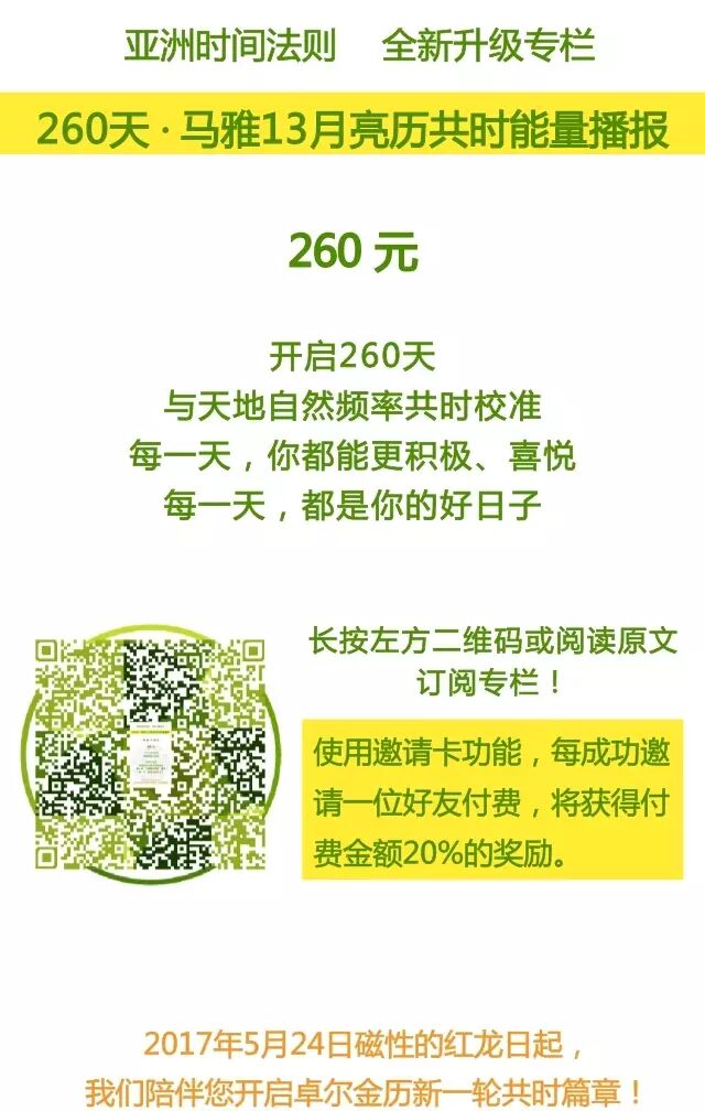 完整升级版马雅能量播报将只在全新专栏内推出,现有「亚洲时间法则」公众号每日图文讯息将只发布部分参考内容,请及时订阅专栏。