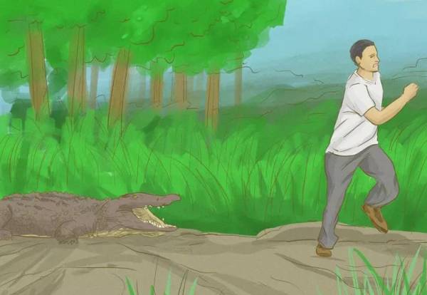 据一位猎人的叙述:采用Z字型的逃跑方式将会使你的速度慢下来,而直线逃跑的方式才是最快的。鳄鱼在陆地上的最快移动速度为每小时11英里,而且鳄鱼还不能持续性快速移动,如果追逐猎物的时间太长,它们会放弃猎物。