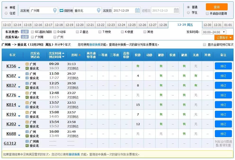 截至今天,登录12306官方网站,查询12月26日以后的广州到重庆车票信息,暂时没有新的线路可供选择。