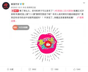 在刚刚闭幕的2017成都国际车展上,最受关注的汽车类直播,当属新浪汽车策划的“真心话大冒险”主题直播,长达5小时的节目妙趣横生,交替穿插的互动环节中,无论是业界大咖的出镜释疑,还是车圈红人的搞笑吐槽,围观车友都给予了热情回应。与直播同期互动的微博平台上,还发起话题活动,即参与话题就有机会赢取新浪汽车周边礼物,引得网友互动更为踊跃。平台间的呼应,活跃了车展氛围,又提升了网友在后续活动中的参与度。