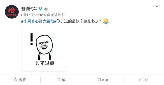 预热阶段,新浪汽车通过微博平台,以微博故事等形式向网友征集车展需求,所设话题随后分别引爆不同热点。8月7日,新浪汽车以#车展真心话大冒险#为题,抛到微博平台引导车友互动兼攒人气。“你最希望未来的车上有哪些牛逼哄哄的配置”、“说起女司机,你脑海里冒出的第一个词是__”等各种脑洞大开的问题,很快聚起数拨儿热聊人群。 “你开过的最快车速是多少”,在微博上获得了500+的转发评论量。配合8月2日开始的#2017成都车展#,在两大话题的牵引作用下,车展信息多层级传播,活动曝光度得以提升。