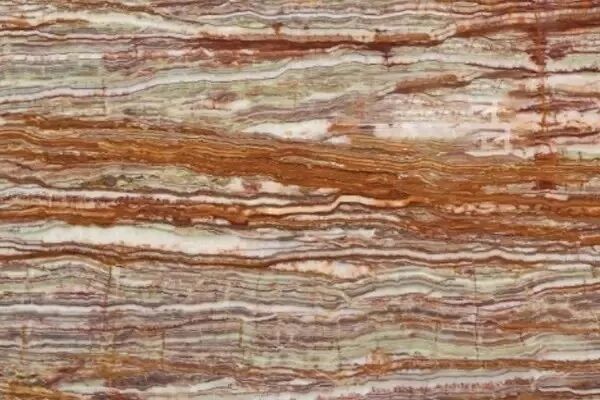 产自墨西哥,底色为金黄色,版面带有较多的细小白线,红色朵状纹理及黑色纹理,局部带有大块白色、黑色疤纹。裂纹较少,无孔洞,石质细腻,通透性强。