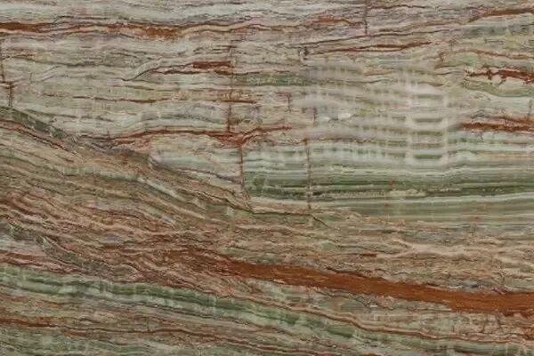 产自巴基斯坦,底色为绿色、黄褐色、白色条纹相见呈横向纹理,绿色条纹较多,版面中有纵向黄褐色根线及少部分裂纹,横向纹理局部有错落整齐。孔洞较多在黄褐色根带中,石质一般,绿色、白色部分通透性好。