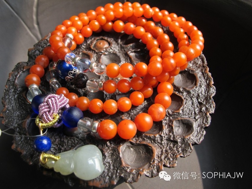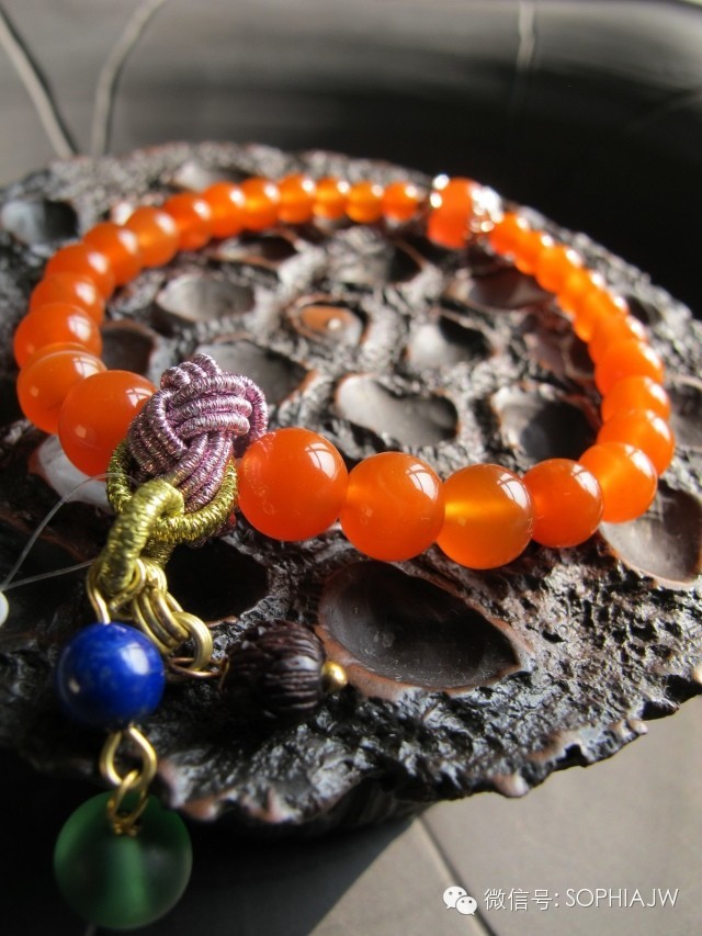 质感上,南红是胶质感的。就算全红的珠子也不是不透光的,可以看到色彩由内到外是通透的,相符的。反之,就算无色的珠子也有种朦胧的感觉,这里注意,这种质感是暂时无法作假的,除非老料新工。而假南红基本都是做纯红的。