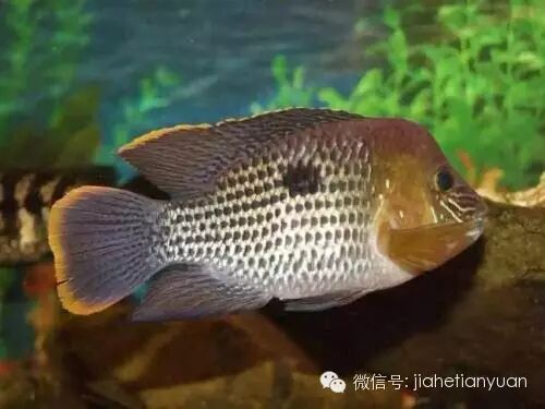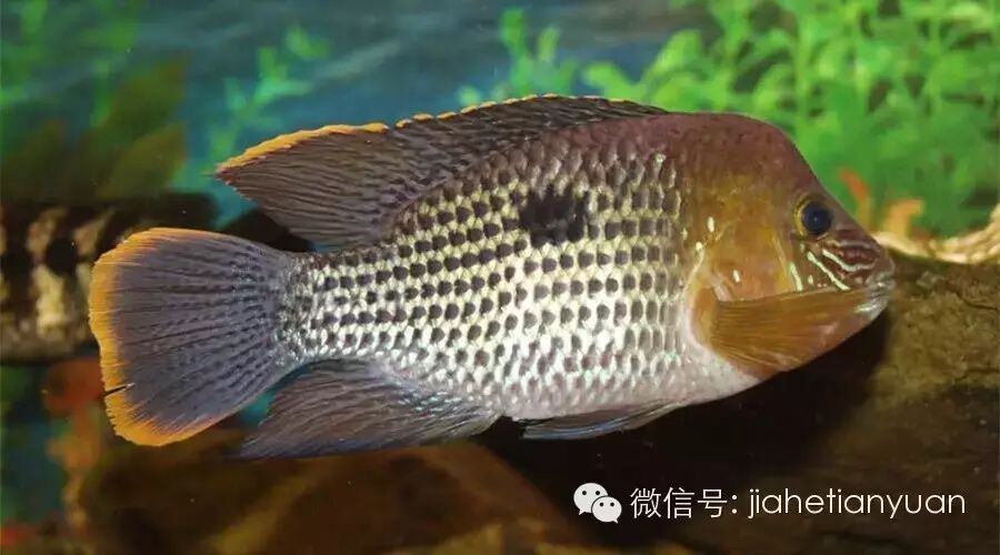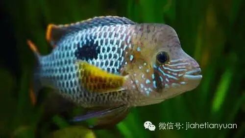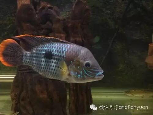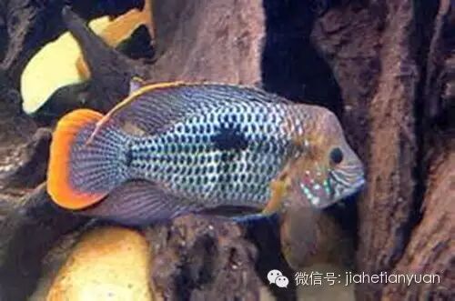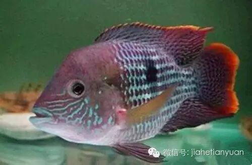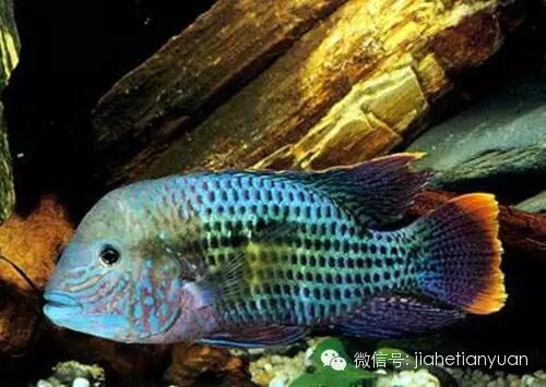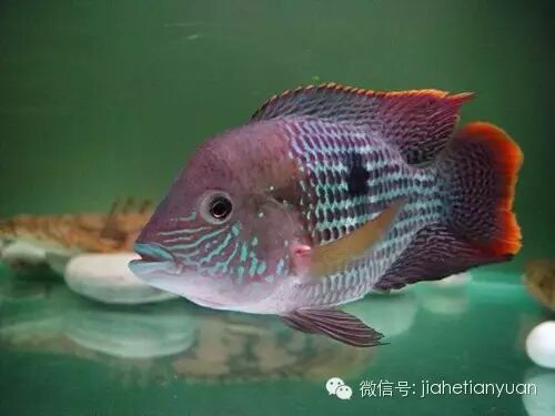 玉面皇冠,又叫“红尾皇冠”,属慈鲷科,原产南美洲,属当地的食用鱼。它全身披着金属蓝,背鳍、臀鳍和尾鳍镶着鲜明的红边,与全身的金属蓝形成强烈的对比。雄鱼的头部顶着一个暗红色的肉瘤,像戴着皇冠的霸者,给人一种长寿、富贵的感觉。