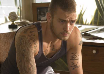 贾斯丁在《终极黑帮》(ALpha Dog)饰演一个毒贩,这个混混时不时就露出上身、健身、吸毒,眼眶永远迷幻,上半身的刺青显示他玩世不恭的态度,包括了胸前大大的「1976」,腰部的「风土水火」,不过好笑的是他的二头肌居然刺了一个「溜冰」…