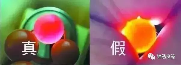 在强光的照射下,真南红看起成色十分均匀,整体通红,透光度低;染色石英岩则能看到因染色而内部炸裂成的网状结构,而且颗粒较粗,红色不够均匀。