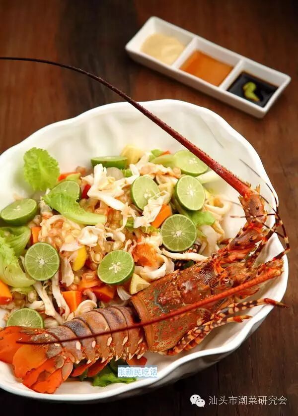 生菜龙虾做法特别,是潮州的古早味。一是将煮熟的龙虾肉、火腿和鸡蛋白切片后相间摆成龙虾状,蛋黄还不能浪费,要做成蘸料蛋黄酱;二是盘里一定要用鲜嫩的生菜叶和番茄片垫底。生菜又名香菜,属于叶用莴笋(茎用莴笋俗称香菜心)。现在虽然很普通,全国各地均广泛种植和食用,但在一百年前刚引入中国的时候,却是一种奇异的食物。民国初年胡朴安《中华全国风俗志》记录的潮州七种特异食俗中,其中就有香菜。胡先生书中记述说:“香菜一名香花菜,其嫩叶可包饭(内和杂香)生食。”认为是别处所无的食物。在潮州菜中,除了生菜龙虾,还有生菜牛肉丸、生菜包炒翅等。由此我猜想,将生菜引入中国,大概是从潮州开始的吧。