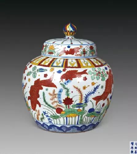 明 五彩鱼藻纹盖罐