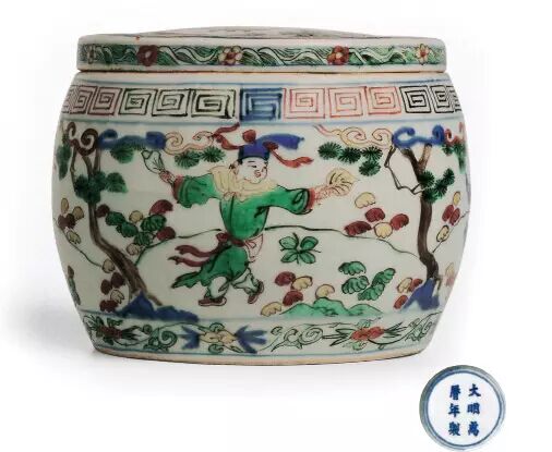 明万历 五彩“舞蹈人物”图鼓式盖罐
